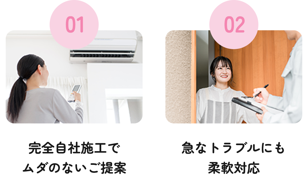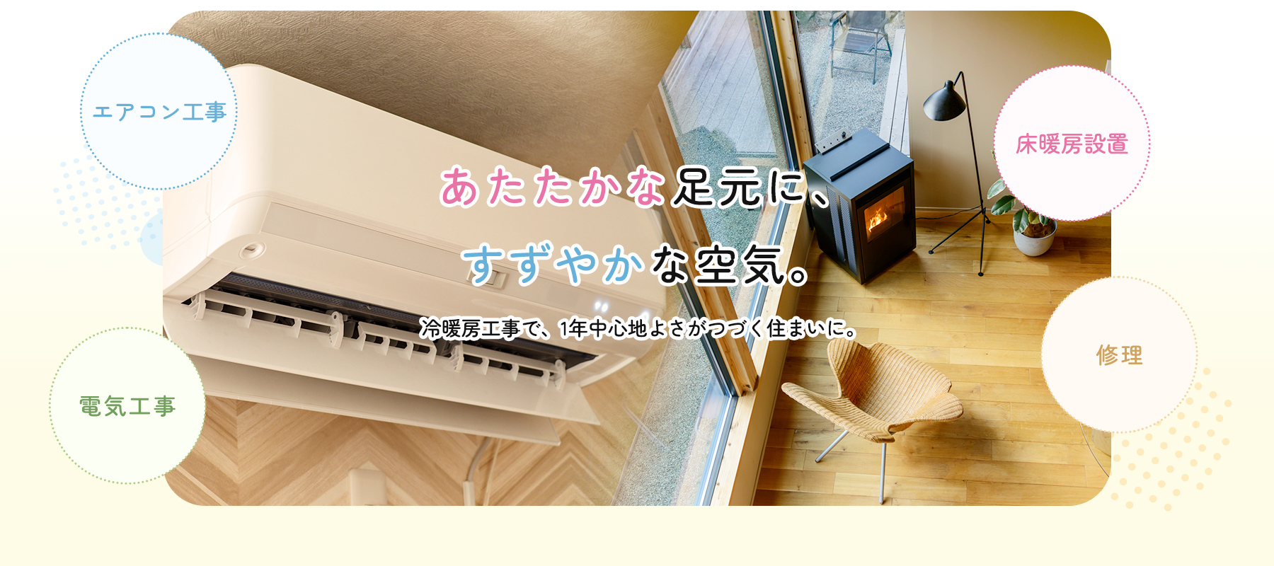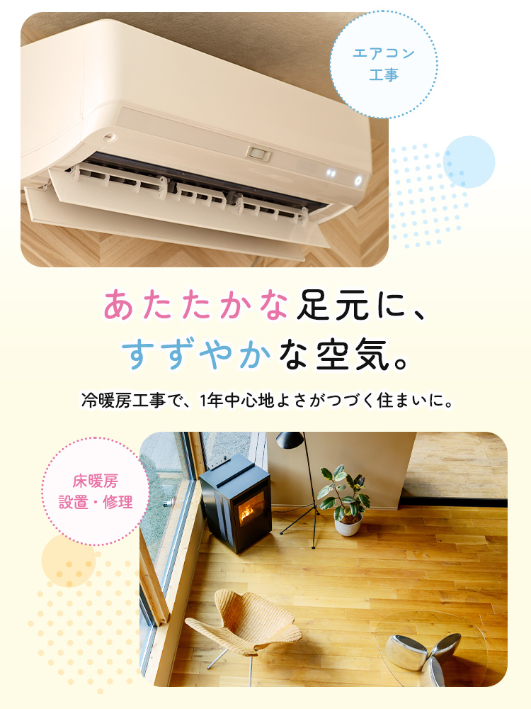 エアコン取付け・取外しや、配管の見直し、床暖房の点検からリフォーム提案・施工まで一貫対応。冷暖房設備の最適化を、トータルでサポートいたします。